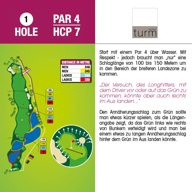 Ein absolutes Spiel-Highlight ist Loch 15. Fasziniert schweift das Auge in die Vertikale, während das Golferherz für eine zeitlang schneller schlägt angesichts dieses Par 3 mit der größten Höhendifferenz Europas.