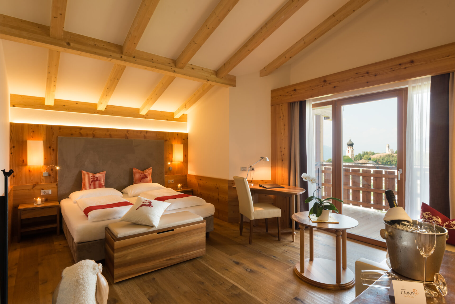 Der 2012 komplett neu errichtete Holzbau und die ökologische Bauweise machen das Hotel Emmy einzigartig. Die stilvolle Inneneinrichtung aus Lärchen-, Zirm- und Nussholz sowie die Naturlehmwände schaffen ein exklusives Ambiente in den Zimmern und Suiten.
